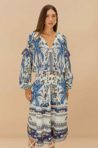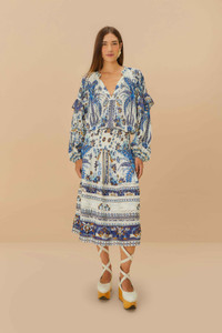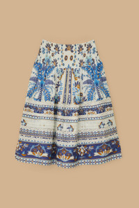 Embrace enchantment with the Off-White Ana Tapestry Organic Cotton Midi Skirt. Adorned with intricate floral and geometric patterns in serene blues and earthy tones, this skirt captures a harmonious blend of artistry and nature. Crafted from responsible materials, its flowing silhouette and gentle pleats create an effortless elegance. Elevate your wardrobe with a piece that resonates warmth and playful charm. GOTS-certified organic cotton has a lower environmental impact than conventional cotton, as it reduces water usage, greenhouse gas emissions, and the amount of chemicals used. Ref.: sku_344869 Composition 57% COTTON 43% VISCOSE Care Instructions MACHINE WASH GENTLE CYCLE, DO NOT BLEACH, DRY FLAT, IRON AT MEDIUM HEAT, DO NOT DRY CLEAN Product manufacturing: CHINA Product printing: CHINA