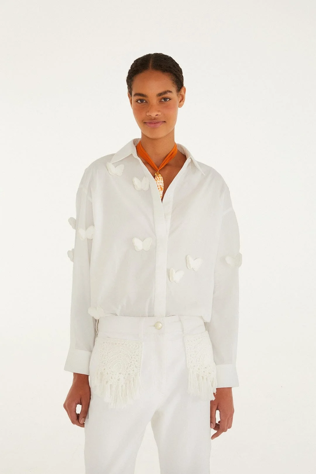 Embrace effortless charm with the Off-White Butterflies Blouse from FARM Rio. This airy top features a soft collar neckline and a playful butterfly print in warm, earthy tones that flutter gracefully across the off-white fabric. Its relaxed silhouette drapes beautifully, inviting movement and comfort, while subtle gathers at the sleeves add gentle volume. Perfect for bringing a touch of Brazilian sunshine to your everyday look. - Closure: Center Front Buttons - Button type: Plastic Buttons - Sleeve type: Long Sleeve Ref.: 348778 Composition 100% COTTON Care Instructions HAND WASH SEPARATELY, DO NOT BLEACH, DRY FLAT, LOW IRON, DO NOT DRY CLEAN Fabric origin: China Product manufacturing: China Product printing: China