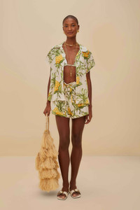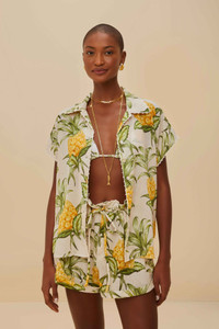 Experience the playful elegance of the Off-White Delicate Pineapple Short. This charming piece showcases a vibrant pineapple pattern that dances across a soft off-white backdrop. The shorts feature a delightful ruffle detail at the waist, bringing a touch of whimsy to your wardrobe. With a relaxed fit and tropical flair, these shorts embody the carefree spirit of FARM Rio, inviting warmth and joy into every step. - Closure: Zipper, hook and eye - Fly: Functional - Pockets: Side seam pockets - Leg fit: Straight Ref.: sku_336724 Composition 100% COTTON Care Instructions MACHINE WASH GENTLE CYCLE, DO NOT BLEACH, DO NOT TUMBLE DRY, LINE DRYING, IRON AT LOW HEAT, DRY CLEAN WITH ANY SOLVENT EXCEPT TRICHLOROETHYLENE Product manufacturing: INDIA Product printing: INDIA