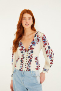 Embrace effortless charm with the Off-White Malu Winter Buttoned Long Sleeve Blouse from FARM Rio. Crafted in a soft off-white hue, it features a flattering V neckline that gently frames the collarbone. Delicate button detailing adds a touch of elegance, while the relaxed silhouette offers comfort and flow. Subtle puff sleeves bring a playful dimension, making this blouse a perfect canvas for both cozy winter days and vibrant city strolls. - Closure: Center Front Buttons - Button type: Fabric Covered Button - Sleeve type: Long Sleeve Ref.: 350083 Composition 100% VISCOSE Care Instructions MACHINE WASH GENTLE CYCLE, DO NOT BLEACH, DO NOT TUMBLE DRY, LINE DRY, IRON AT MEDIUM, DRY CLEAN WITH ANY SOLVENT EXCEPT TRICHLOROETHYLENE Fabric origin: Turkey Product manufacturing: Turkey Product printing: Turkey