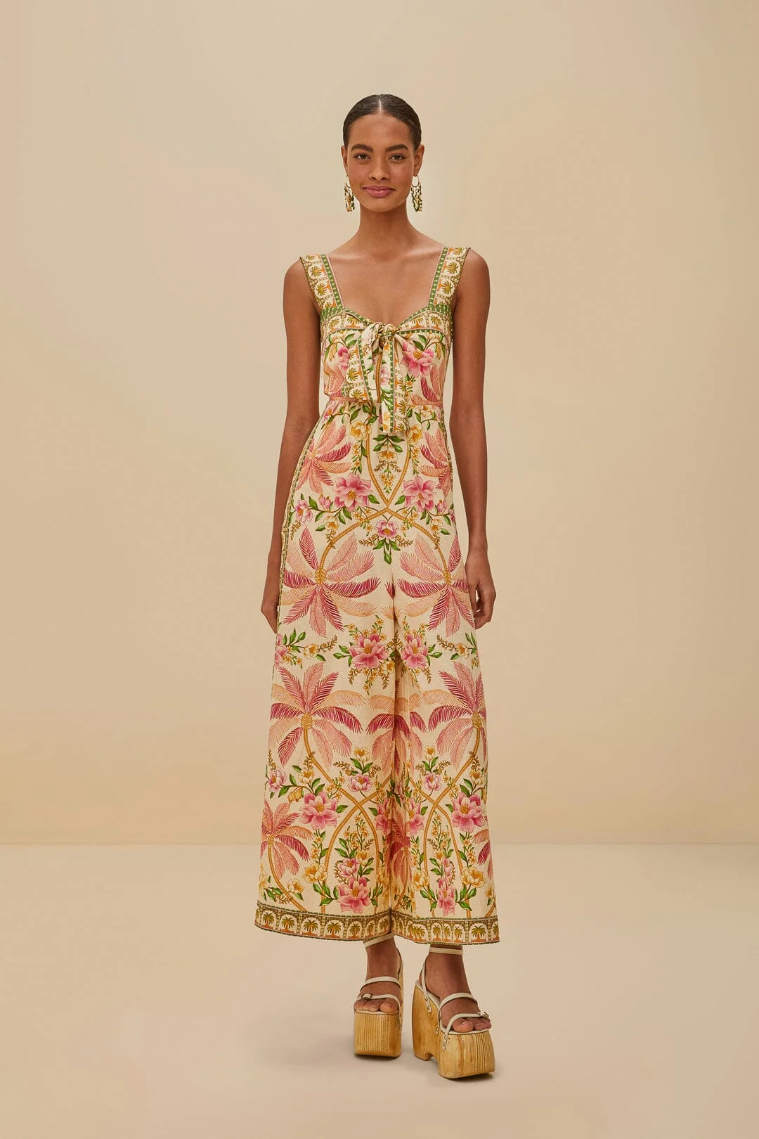 Embrace the enchanting allure of the Off-White Palm Dream LENZING™ ECOVERO™ Euroflax™ Jumpsuit. This delightful piece features a sweetheart neckline and a captivating tropical print that dances with pink and green hues. Its easy, flowing silhouette is complemented by wide straps, offering a harmonious blend of elegance and playfulness. Crafted from responsible materials, this jumpsuit invites you to step into a world of vibrant dreams and effortless charm. - Closure: Invisible zipper at side seam - Button type: Plastic button - Pockets: Side seam pockets - Leg fit: Straight - Sleeve type: Sleeveless LENZING™ ECOVERO™: the eco-responsible fibers generate up to 50% lower emissions and water impact compared to generic viscose. Ref.: sku_335863 Composition 55% LINEN 45% VISCOSE Care Instructions MACHINE WASH GENTLE CYCLE, DO NOT BLEACH, DRY FLAT, IRON AT MEDIUM HEAT, DO NOT DRY CLEAN Product manufacturing: CHINA Product printing: CHINA