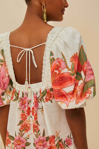 Step into sunlit days with the off-white summer fruit blouse by FARM Rio. This masterpiece showcases vibrant floral patterns that dance across a gentle off-white canvas. The square neckline introduces a classic touch, while voluminous sleeves add playful flair. Intricate lace and a charming back tie complete the picture of breezy sophistication. Perfect for those who embrace color and joy in every stitch. - Sleeve type: Short sleeve Ref.: sku_336450 Composition 55% LINEN 45% VISCOSE Care Instructions MACHINE WASH GENTLE CYCLE, DO NOT BLEACH, DO NOT TUMBLE DRY, LINE DRY IN THE SHADE, IRON AT LOW HEAT, DRY CLEAN WITH ANY SOLVENT EXCEPT TRICHLOROETHYLENE Product manufacturing: INDIA Product printing: INDIA