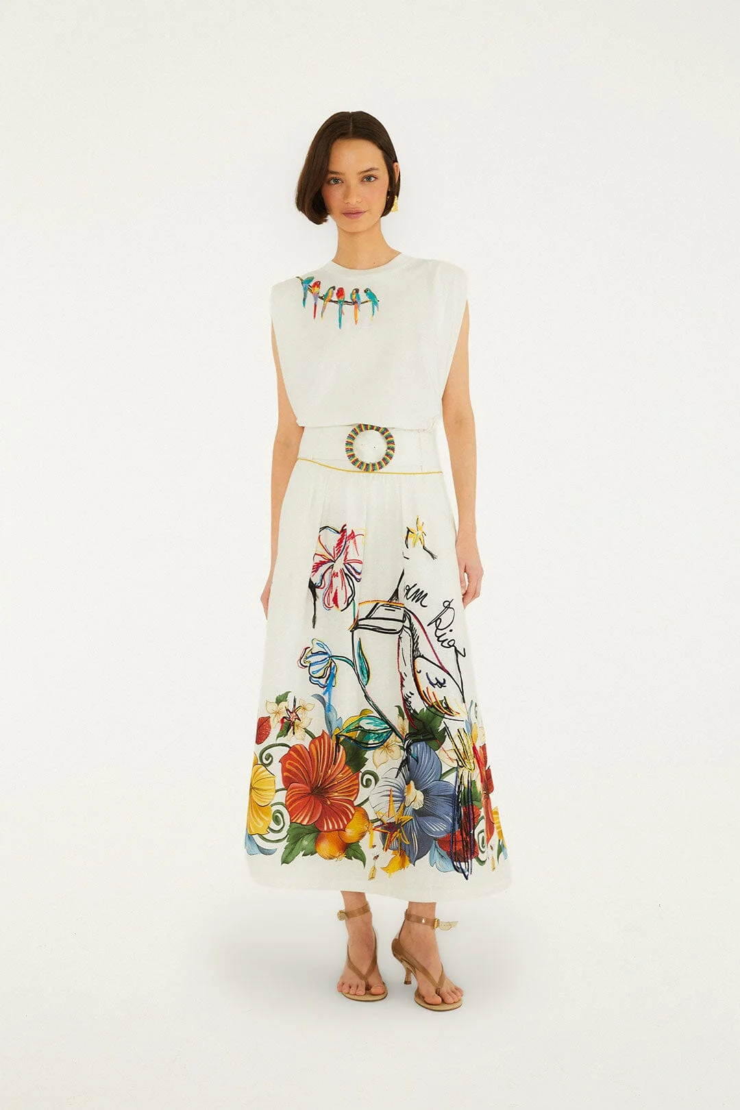 Embrace effortless elegance with the Off-White Tropi Embroidered Euroflax™ Premium Linen Maxi Skirt by FARM Rio. Crafted from breathable, luxe linen, this skirt features vibrant tropical embroidery that dances along its flowing silhouette. The soft off-white base beautifully contrasts the lush, colorful patterns, while the flattering cut gently sways with every step, inviting warmth and playful movement into your wardrobe. A true celebration of Brazilian spirit and craftsmanship. - Closure: Invisible Zipper At Side Seam - Pockets: Side Seam Pockets Ref.: 353729 Composition 100% LINEN Care Instructions HAND WASH SEPARATELY, DO NOT BLEACH, DRY FLAT, LOW IRON, DRY CLEAN USING ANY SOLVENT EXCEPT TETRACHLORETHYLENE Fabric origin: China Product manufacturing: China Product printing: China