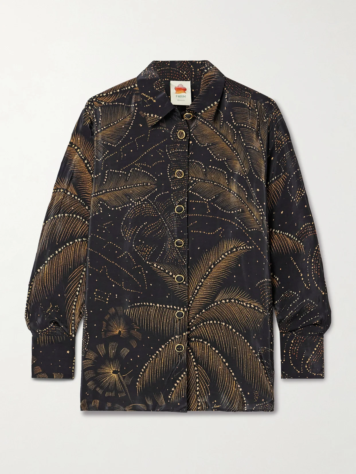 Farm Rio's shirt may be inspired by traditional pajama styles, but it's chic enough to wear out of the house, too. Cut from crepe de chine, it's printed with a 'Golden Foliage' motif and embellished with tiny light-reflecting crystals throughout. Wear it with the matching pants or a skirt, depending on the occasion.