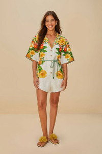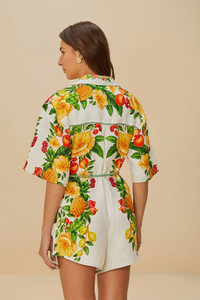 Embrace a touch of paradise with the Off-White Picnic Flowers Euroflax™ Premium Linen Romper. Crafted from responsible materials, this playful piece features a vibrant floral print that dances across the crisp linen canvas. The collar neckline adds a classic touch, while wide sleeves and a cinched waist create an effortlessly chic silhouette. The enchanting blend of colors and patterns brings warmth and joy to any occasion. - Closure: Center front buttons - Button type: Plastic button - Leg fit: Straight - Sleeve type: Short sleeve LENZING™ ECOVERO™: the eco-responsible fibers generate up to 50% lower emissions and water impact compared to generic viscose. Ref.: sku_336647 Composition 100% LINEN Care Instructions HAND WASH SEPARATELY, DO NOT BLEACH, DO NOT TUMBLE DRY, DRY FLAT, IRON AT LOW HEAT, DRY CLEAN WITH ANY SOLVENT EXCEPT TRICHLOROETHYLENE Product manufacturing: CHINA Product printing: CHINA
