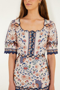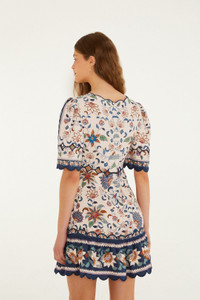 Embrace effortless charm with the Pink Floral Delhi Tapestry Scallop Cut-Out Mini Dress by FARM Rio. Crafted from breathable Euroflax™ premium linen, this dress features a playful round neckline and delicate scalloped cut-outs that add a whimsical touch. Blooming in vibrant pinks and intricate floral patterns, its silhouette gently skims the body, celebrating natural movement and warm, sunlit days with softness and spirited elegance. - Closure: Invisible Zipper At Side Seam - Button type: Fabric Covered Buttons - Sleeve type: Short Sleeve Ref.: 348873 Composition 55% LINEN 45% VISCOSE Care Instructions MACHINE WASH, GENTLE CYCLE, DO NOT BLEACH, DRY FLAT, LOW IRON, DO NOT DRY CLEAN Fabric origin: China Product manufacturing: China Product printing: China
