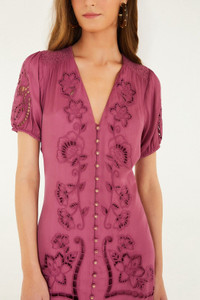 Embrace effortless charm with the Pink Richelieu Lenzing Ecovero Viscose Maxi Dress from FARM Rio. This flowing silhouette features a delicate V neckline and exquisite Richelieu eyelet details that add a playful texture to its blush pink canvas. Crafted from responsibly sourced Lenzing Ecovero fabric, it feels light and breathable, perfect for sun-drenched days or gentle evening breezes. The dress captures warmth and softness in every stitch, inviting joyful moments. - Closure: Center Front Buttons - Button type: Fabric Covered Button - Sleeve type: Short Sleeve Ref.: 344401 Composition 54% VISCOSE 46% RAYON Care Instructions HAND WASH SEPARATELY, DO NOT BLEACH, DO NOT TUMBLE DRY, DRY FLAT, IRON AT LOW HEAT, DRY CLEAN WITH ANY SOLVENT EXCEPT TRICHLOROETHYLENE Fabric origin: China Product manufacturing: China Product printing: China