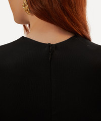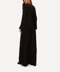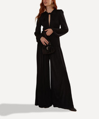 DETAILS Black crepe jumpsuit Fluid silhouette Long length Pleated wide leg Long blouson sleeves V-neckline with knotted detail Back zipper COMPOSITION & CARE 100% Viscose Hand wash