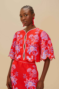 Embrace vibrant charm with the Red Porcelain Garden Euroflax™ Premium Linen Blouse. This captivating piece boasts a playful round neckline and beautifully scalloped short sleeves. Adorned with intricate floral patterns in bold red and soothing pastels, it invites a sense of artistic elegance. Crafted from responsible materials, its breezy silhouette adds a touch of grace, making every moment feel like a carefree stroll through a blooming garden. - Closure: Keyhole with button - Button type: Beaded button - Sleeve type: Short sleeve LENZING™ ECOVERO™: the eco-responsible fibers generate up to 50% lower emissions and water impact compared to generic viscose. Ref.: sku_336468 Composition 100% LINEN Care Instructions MACHINE WASH GENTLE CYCLE, DO NOT BLEACH, DO NOT TUMBLE DRY, LINE DRYING, IRON AT LOW HEAT, DO NOT DRY CLEAN Product manufacturing: CHINA Product printing: CHINA