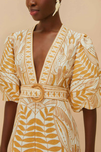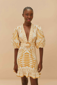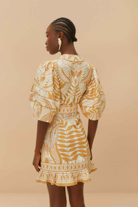 Embrace the allure of the off-white lace nature LENZING™ ECOVERO™ Euroflax™ mini dress. Its V neckline gracefully complements puffed sleeves and a fitted waist adorned with a statement belt. The enchanting leaf and floral motifs dance over an off-white canvas, while charming ruffles trim the hem, adding a playful touch. Crafted from responsible materials, this dress is where elegance meets conscious style. LENZING™ ECOVERO™: the eco-responsible fibers generate up to 50% lower emissions and water impact compared to generic viscose. Ref.: sku_331845 Composition 55% LINEN 45% VISCOSE Care Instructions MACHINE WASH GENTLE CYCLE, DO NOT BLEACH, DRY FLAT, IRON AT MEDIUM HEAT, DO NOT DRY CLEAN Product manufacturing: CHINA Product printing: CHINA