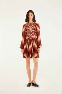 The Red Amanda Stripes Tapestry Quilted Mini Dress is a vibrant celebration of bold prints and intricate textures. Its high neckline frames the detailed tapestry-inspired front panel, while the rich red and beige stripes dance playfully across the flowing skirt and billowy long sleeves. Soft quilting and delicate embroidery enhance the artisanal charm, creating a dress that embraces warmth and whimsy in a uniquely feminine silhouette. - Closure: Invisible Zipper At Center Back - Button type: Plastic Button - Sleeve type: Long Sleeve Ref.: 339779 Composition 100% VISCOSE Care Instructions MACHINE WASH GENTLE CYCLE, DO NOT BLEACH, DRY FLAT, IRON AT MEDIUM HEAT, DO NOT DRY CLEAN Fabric origin: China Product manufacturing: China Product printing: China