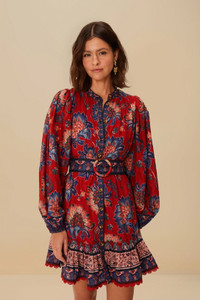 The Red Luang Mini Dress from FARM Rio captures vibrant charm with its artistic floral patterns splashed across a warm red canvas. The high neckline and voluminous sleeves create a sophisticated silhouette, while intricate ruffles add a playful touch. A cinched waist with a statement belt brings a flattering shape, making this piece a delightful blend of elegance and spirited flair, perfect for any joyful occasion. - Closure: Center front buttons - Button type: Plastic button - Pockets: Side seam pockets - Sleeve type: Long sleeve Ref.: sku_336927 Composition 60% COTTON 40% VISCOSE Care Instructions MACHINE WASH GENTLE CYCLE, DO NOT BLEACH, DRY FLAT, IRON AT MEDIUM HEAT, DO NOT DRY CLEAN Product manufacturing: CHINA Product printing: CHINA