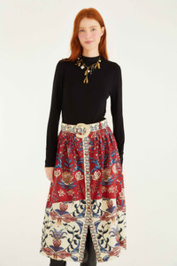Embrace the warmth of the season with the Red Winter Breeze skirt, a flowing midi silhouette in 100% certified organic cotton. This enchanting piece features a captivating mix of vibrant red and creamy floral panels, accented by an embroidered belt that gently cinches the waist. The playful button-down front invites movement, while the artful pattern blends nature’s charm with effortless elegance. Crafted sustainably, it’s a soulful addition to your wardrobe. - Closure: Center Front Buttons - Button type: Fabric Covered Button - Pockets: Side Seam Pockets Ref.: 340549 Composition 100% COTTON Care Instructions MACHINE WASH GENTLE CYCLE, DO NOT BLEACH, DO NOT TUMBLE DRY, LINE DRYING, IRON AT LOW HEAT, DO NOT DRY CLEAN Fabric origin: China Product manufacturing: China Product printing: China