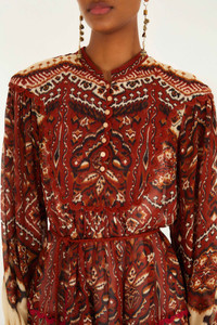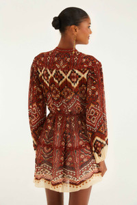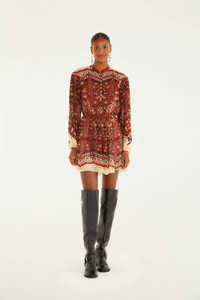 The Sand Ainika Pineapple Tapestry Long Sleeve Mini Dress enchants with its rich tapestry-inspired print in warm, earthy reds and creams. Designed with a high neckline and a gently cinched waist, it shapes a playful, flowing silhouette. Delicate button details and subtle scalloped trim at the shoulders add a touch of charm. This dress invites you to embrace comfort while radiating a cozy, artistic spirit. - Closure: Invisible Zipper At Side Seam - Button type: Metal Button - Sleeve type: Long Sleeve Ref.: 340019 Composition 100% VISCOSE Care Instructions MACHINE WASH GENTLE CYCLE, DO NOT BLEACH, DO NOT TUMBLE DRY, LINE DRYING, IRON AT LOW HEAT, DO NOT DRY CLEAN Fabric origin: India Product manufacturing: India Product printing: India