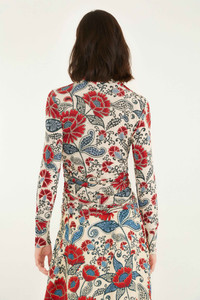 The Sand Francesca Jersey Blouse embraces elegance with its high neckline and soft jersey fabric. A warm sand backdrop showcases a playful, vibrant floral print in bold reds and soothing blues. The blouse gently gathers at the waist, creating a flattering silhouette that dances with every movement. Long sleeves and a slightly fitted cut bring comfort and style together, making it a captivating piece full of life and charm.- Sleeve type: Long Sleeve Ref.: 346004 Composition 85% RAYON 15% ELASTANE Care Instructions MACHINE WASH GENTLE CYCLE, DO NOT BLEACH, DO NOT TUMBLE DRY, LINE DRYING, IRON AT LOW HEAT, DRY CLEAN WITH ANY SOLVENT EXCEPT TRICHLOROETHYLENE Fabric origin: Turkey Product manufacturing: Turkey Product printing: Turkey