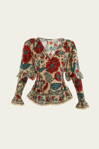 The Sand Francesca Long Sleeve Blouse embraces a vibrant floral print in warm reds and cool blues against a sandy beige canvas, crafting a lively harmony of colors. Its gently puffed sleeves give a soft silhouette, while delicate shirring at the waist and cuffs shapes the form beautifully. A charming scalloped trim edges the deep V neckline and hem, adding a playful, handcrafted touch that invites a casual yet refined spirit. - Closure: Invisible Zipper At Center Front - Sleeve type: Long Sleeve Ref.: 339812 Composition 100% VISCOSE Care Instructions MACHINE WASH GENTLE CYCLE, DO NOT BLEACH, DO NOT TUMBLE DRY, LINE DRY IN THE SHADE, IRON AT LOW HEAT, DRY CLEAN WITH ANY SOLVENT EXCEPT TRICHLOROETHYLENE Fabric origin: India Product manufacturing: India Product printing: India
