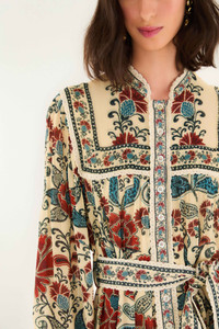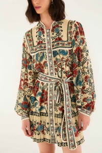 The Sand Francesca Long Sleeve Mini Dress weaves warmth and charm into its sand-hued canvas, adorned with a vibrant, intricate floral pattern in lush reds and calming blues. The playful silhouette flows freely from a delicate round neckline, enhanced by subtle gatherings below the yoke and along the skirt. Softly puffed sleeves and a matching belt add gentle definition, making this dress a radiant embrace of comfort and joyful elegance. - Closure: Center Front Buttons - Button type: Plastic Button - Sleeve type: Long Sleeve Ref.: 339799 Composition 100% VISCOSE Care Instructions MACHINE WASH GENTLE CYCLE, DO NOT BLEACH, DO NOT TUMBLE DRY, LINE DRY IN THE SHADE, IRON AT LOW HEAT, DRY CLEAN WITH ANY SOLVENT EXCEPT TRICHLOROETHYLENE Fabric origin: India Product manufacturing: India Product printing: India
