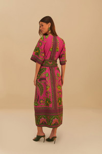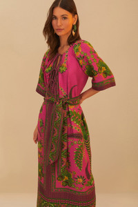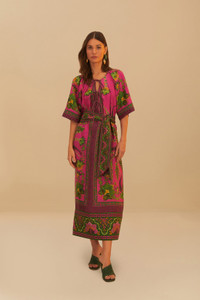 Embrace the vibrant allure of the Pink Ana Tapestry Maxi Dress, a blend of rich pink hues with striking green accents in a tapestry-inspired pattern. The alluring V-neckline, cinched waist tie, and fluid silhouette promise an enchanting look. It's an artful piece that captures the essence of bohemian elegance, designed for those who dare to stand out with grace and ease. Ref.: sku_328559 Composition 100% LINEN Care Instructions MACHINE WASH, GENTLE CYCLE, DO NOT BLEACH, DO NOT TUMBLE DRY, LINE DRYING, IRON AT LOW HEAT, DRY CLEAN WITH ANY SOLVENT EXCEPT TRICHLOROETHYLENE Product manufacturing: CHINA Product printing: CHINA