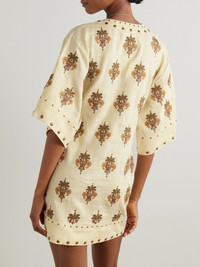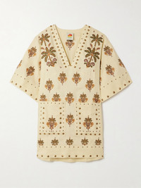 Inspired by its native Rio de Janeiro, Farm Rio's dress is intricately embroidered with coconut trees. It's cut from breathable linen in a tunic-inspired shape and outlined with gold-tone studs. Wear yours with platform sandals and a raffia tote at your next tropical destination. Size & Fit - Fits true to size, take your normal size - Designed for a slightly loose fit - Mid-weight, non-stretchy fabric - Model is 180cm/ 5'11" and is wearing a size XSmall Model measurements: - Bust: 80cm/ 31.5" - Waist: 65cm/ 25.5" - Hip: 89cm/ 35" Details & Care - Sand linen - Slips on - 100% linen - Hand wash