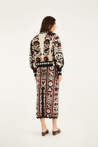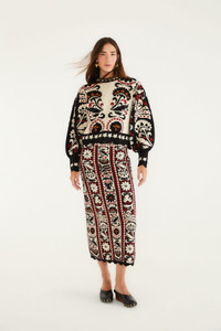 The Stripes Winter Tapestry Knit Skirt from FARM Rio wraps you in cozy sophistication with its rich tapestry-inspired pattern in warm black, cream, red, and rust hues. The silhouette gently follows the body’s curve, ending in a charming scalloped hem that brings playful movement. This midi-length knit marvel pairs bold artistry with snug comfort, inviting you to embrace the season with effortless style and a touch of textured intrigue. Ref.: 340913 Composition 30% POLYESTER 24% VISCOSE 24% POLYAMIDE 22% ACRYLIC Care Instructions HAND WASH SEPARATELY, DO NOT BLEACH, DO NOT TUMBLE DRY, DRY FLAT, IRON AT LOW HEAT, DRY CLEAN WITH ANY SOLVENT EXCEPT TRICHLOROETHYLENE Fabric origin: China Product manufacturing: China Product printing: China