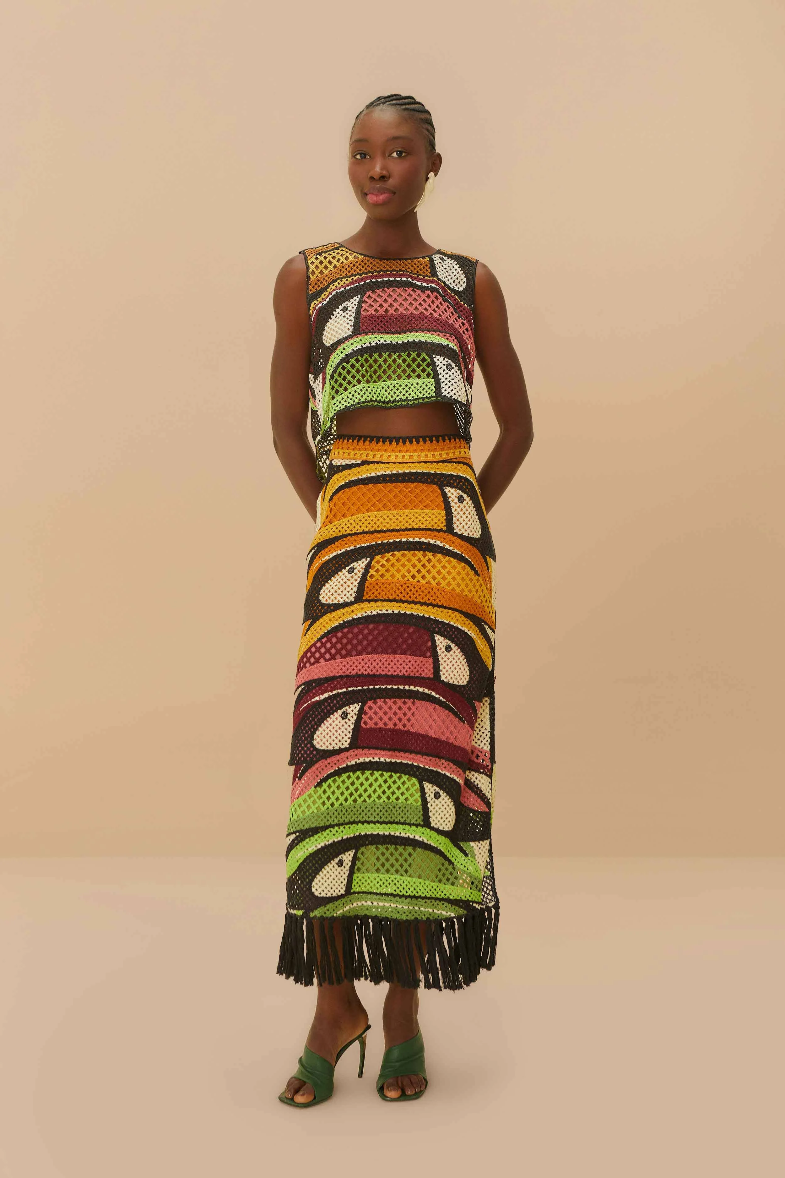 Embrace vibrant sophistication with the Multicolor Toucan Tree Crochet Skirt by FARM Rio. This playful piece features a lively toucan pattern in bold hues of orange, pink, green, and yellow, crafted in intricate crochet. The unique silhouette is accentuated by charming fringed hem detailing, adding a touch of whimsy. Perfect for infusing a sense of artistic flair and tropical charm into your wardrobe. FARM Rio Ref.: sku_331970 Composition 100% POLYESTER Care Instructions HAND WASH SEPARATELY, DO NOT BLEACH, DO NOT TUMBLE DRY, DRY FLAT, IRON AT LOW HEAT, DRY CLEAN WITH ANY SOLVENT EXCEPT TRICHLOROETHYLENE Product manufacturing: CHINA Product printing: CHINA