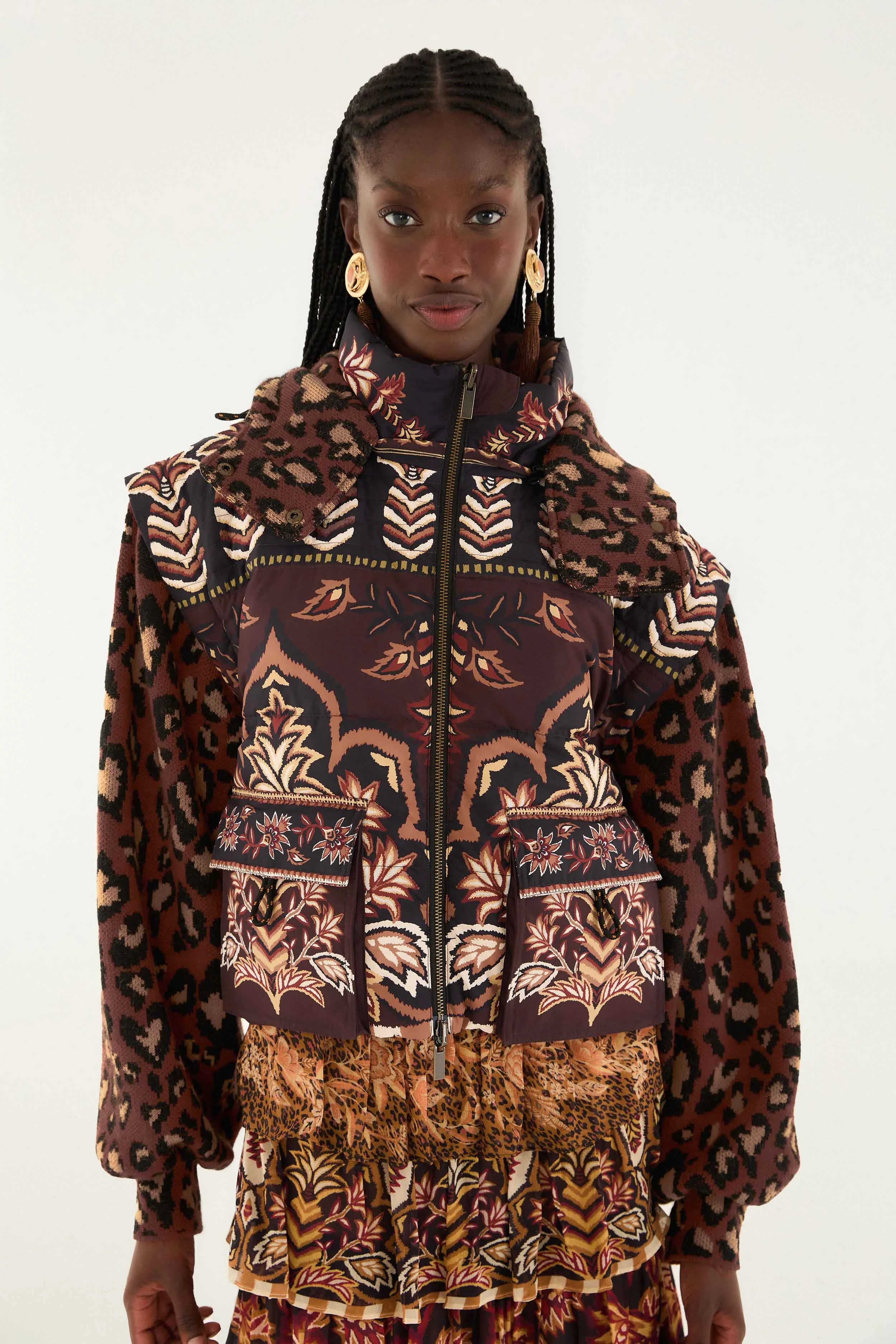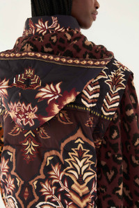 The Brown Winter Ainika Puffer Jacket invites cosy comfort with its rich brown hues and playful fusion of ornate floral and delicate leopard patterns. Its structured silhouette and high neckline wrap softly around you, while the detachable hood adds versatility. The harmonious contrast of plush animal print sleeves against the quilted, patterned bodice radiates warmth and approachable elegance, making this outerwear a joyful statement on chilly days. - Closure: Center Front Zipper - Button type: Metal Button - Pockets: Patch Pockets - Sleeve type: Long Sleeve Ref.: 346165 Composition 100% POLYESTER + 55% ACRYLIC 35% POLYAMIDE 10% WOOL Care Instructions HAND WASH SEPARATELY, DO NOT BLEACH, DO NOT TUMBLE DRY, DRY FLAT, IRON AT LOW HEAT, DO NOT DRY CLEAN Fabric origin: China Product manufacturing: China Product printing: China