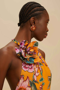 The Orange Wonderful Bouquet Maxi Dress blossoms with vibrant floral patterns on a lush orange canvas, capturing the essence of tropical bliss. Its halter neckline gently ties into an elegant bow, adding a playful touch to its flowing silhouette. With a backless design that whispers sophistication, this dress envelops you in warmth and joy, making every moment feel like a sun-kissed escape. - Closure: Invisible zipper at center back - Sleeve type: Sleeveless Ref.: sku_336675 Composition 100% VISCOSE Care Instructions MACHINE WASH GENTLE CYCLE, DO NOT BLEACH, DO NOT TUMBLE DRY, LINE DRY IN THE SHADE, IRON AT MEDIUM HEAT, DO NOT DRY CLEAN Product manufacturing: INDIA Product printing: INDIA