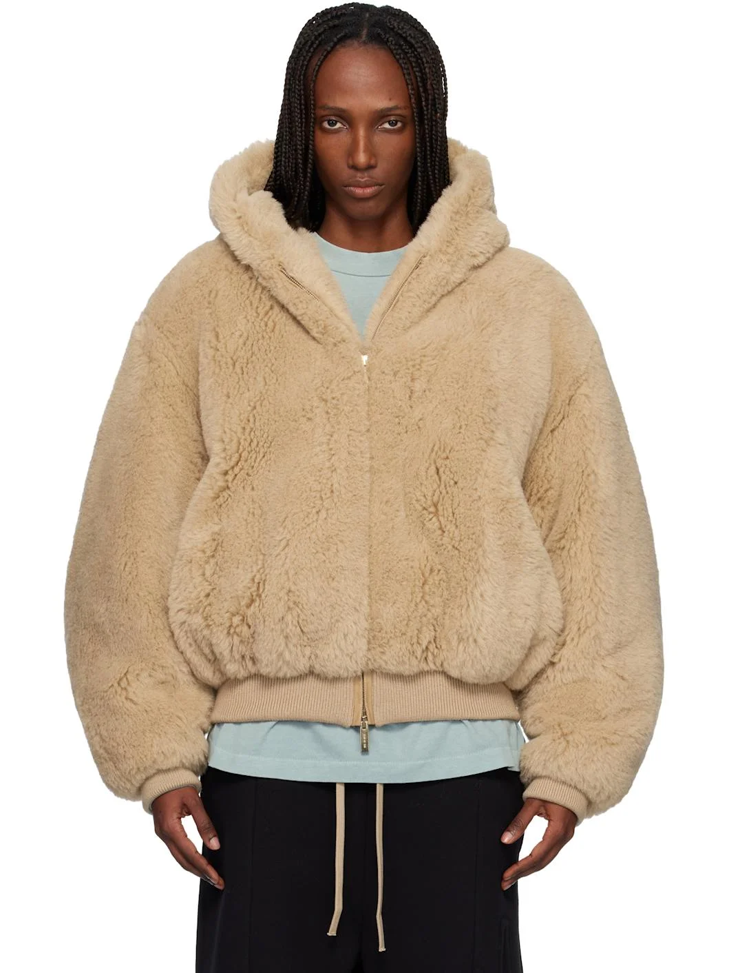 Beige Alpaca Hooded Bomber Jacket