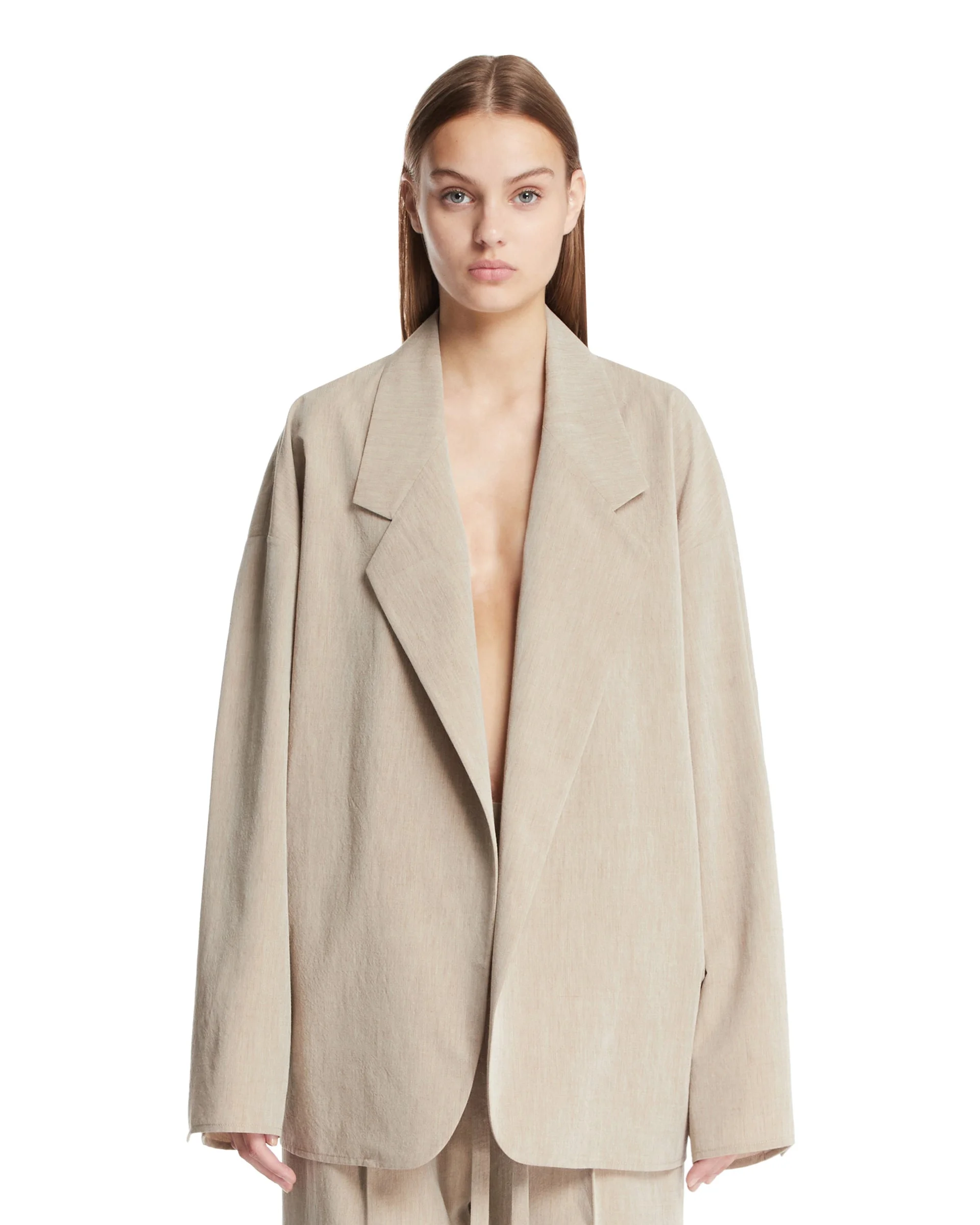 Fear Of God Beige Oversized Blazer. Beige cotton and wool, classic lapel, long sleeves, dropped shoulder design, oversized fit, logo label at the back. Perla is 176 cm and she is wearing size S. DETAILS Model: FG25FW62625WCT288 Composition: 54% Virgin Wool, 46% Cotton Made in: ITALY Season: FW25-26