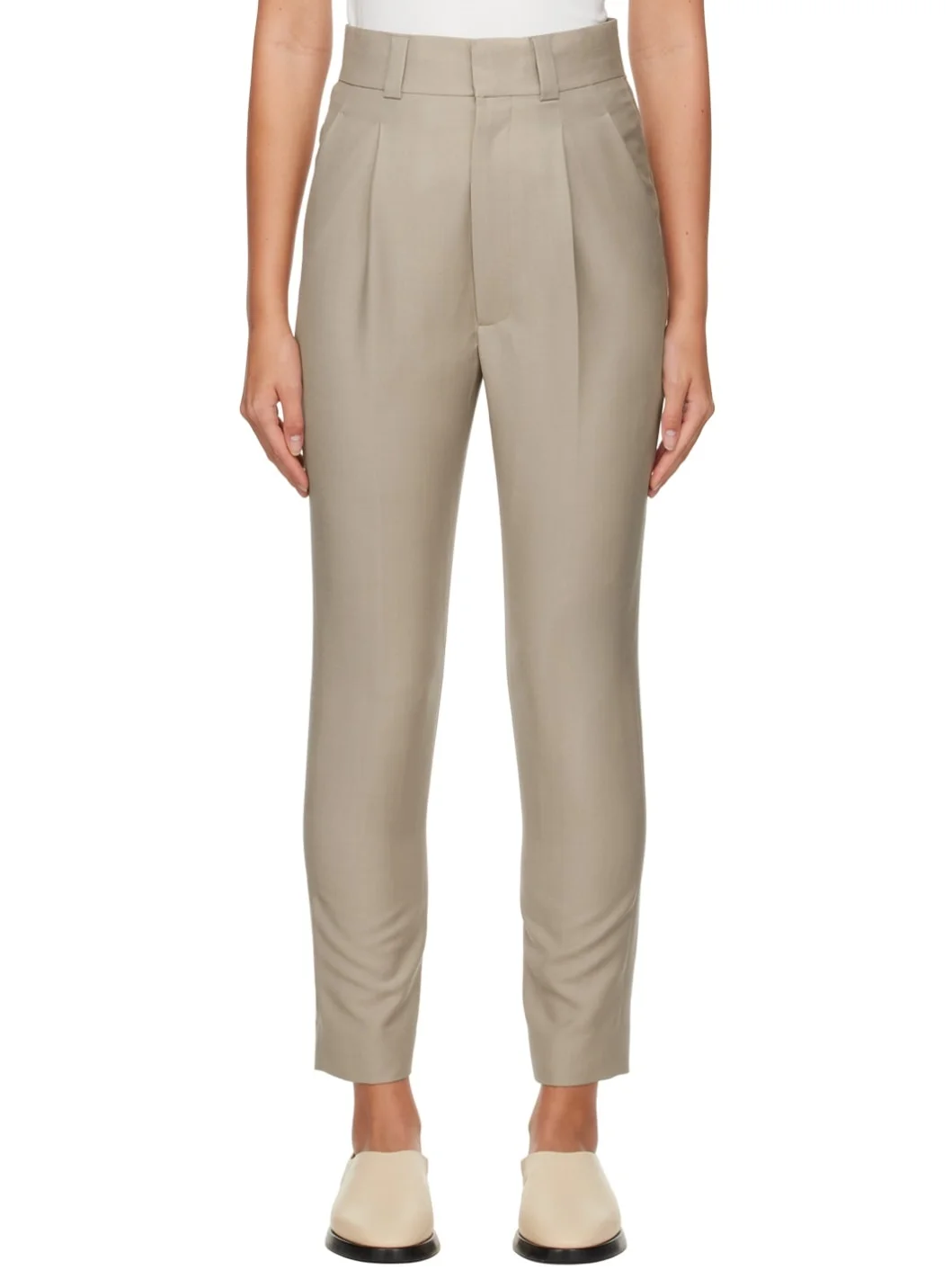 Kid mohair- and wool-blend gabardine trousers. · Belt loops · Four-pocket styling · Zip-fly · Pleated front · Leather logo patch at back pocket · Partial cupro-blend satin lining Part of The Eternal collection. Supplier color: Dusty beige Body: 60% kid mohair, 40% wool. Lining: 60% cupro, 40% polyester. Made in Italy 231782F087001