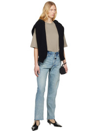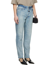 Straight-leg non-stretch denim jeans. Fading and whiskering throughout. · Belt loops · Five-pocket styling · Button fly · Rubberized logo patch at front · Frayed edge at cuffs · Logo-engraved antiqued brass-tone hardware · Contrast stitching in tan Supplier color: Medium indigo 100% cotton. Made in Japan 251782F069000