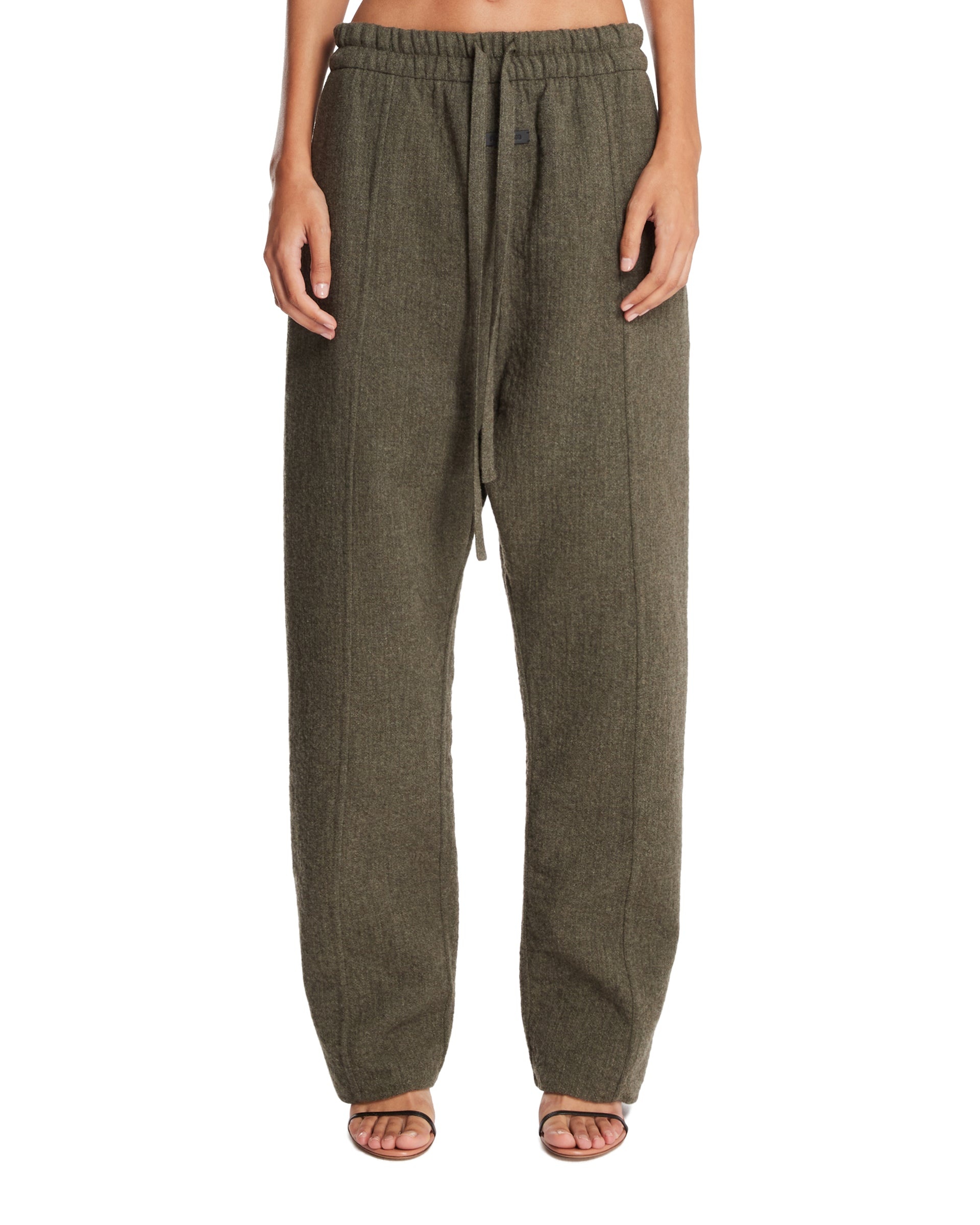 Fear Of God Green Drawstring Trousers. Green wool, cotton, and technical fabric blend. Elasticated waistband with drawstring, two side pockets, pressed pleats, iconic logo patch on the front, straight leg, low crotch, straight hem. Anna is 178 cm and she DETAILS Model: FG25FW35350HDW_019 Composition: 79% Wool, 19% Polyamide, 2% Cotton Made in: ITALY Season: FW25-26