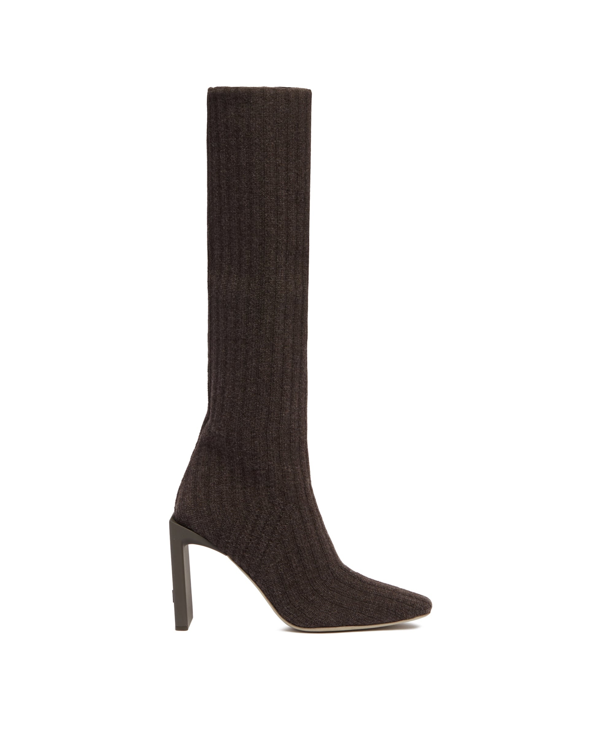 Fear Of God Brown Knit Boots. Brown knitted fabric upper, wide ribbed design, square toe, thin square block heel with logo detail, knee-high height, leather sole. Heel Height: 10 cm DETAILS Model: FG24FW838030KNTBROWN Composition: Upper: 100% Fabric; Sole: 100% Leather; Heel: 100% Rubber Made in: ITALY Season: FW24-25