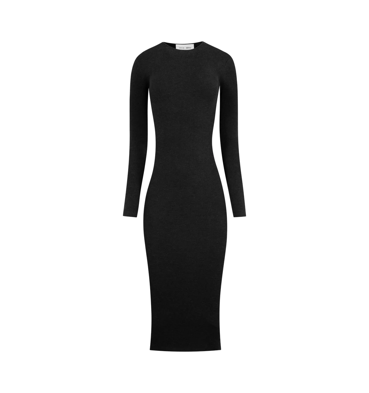 FEAR OF GOD ESSENTIALS Rib Long Sleeve Dress featuring a poly-nylon rib knit, ankle-length, fitted silhouette, rib-knit neckline, long sleeves and a Fear of God Essentials label positioned at the back. 88% polyester, 12% nylon rib knit. DESIGNER STYLE ID: 192H0259021FW COLOR: VINTAGE BLACK