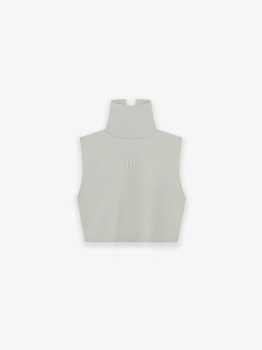 The Fear of God Athletics High Neck Bra Top is elevated in a high-performance stretch fabric to balance compression with the freedom of movement. The women's base layer top displays contemporary style with a slit mockneck and back zipper. Functional details include bonded seams and laser-cut edges. Minimalist branding is symbolized by a sueded 3-Pillars logo on the center front and a sueded black bar label at the back collar. DETAILS - Tight Fit - 64% Recycled Nylon, 36% Recycled Elastane - Mockneck with Slit and Back Zipper - Bonded Seams - Sueded 3-Pillars Logo on Center Front - Sueded Black Bar Label at Back Collar - Imported