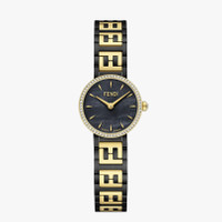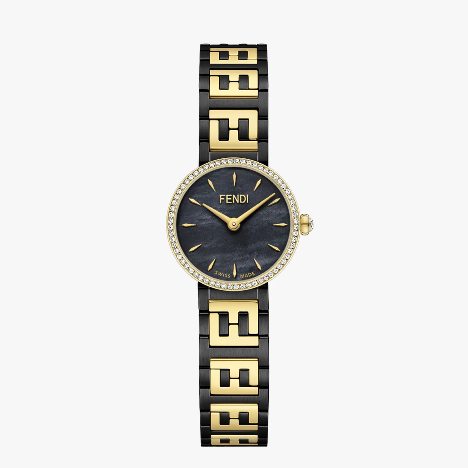 Polished and brushed black-colored stainless steel case, yellow-gold-colored stainless steel bezel and crown, bezel set with 64 diamonds, approx. 0.14 carat, crown set with 1 diamond, approx. 0.02 carat. Black mother-of-pearl dial, yellow-gold-colored indices, yellow-gold-colored hands. Satin-brushed black-colored stainless steel bracelet with polished yellow-gold-colored stainless steel FF logo central links, folding buckle. Composition: 100% STAINLESS STEEL BLACK PVD, 100% STAINLESS STEEL YELLOW 2N PVD, 100% DIAMONDS Product Code: FOW828A2YUF0QA1 Instruction Manual: : :