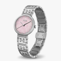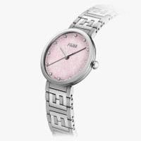 Polished and brushed stainless steel case, crown set with 1 white onyx. Genuine pink opal dial set with 12 diamonds, approx. 0.06 carat, silver-colored indices, silver-colored hands. Satin-brushed stainless steel bracelet with polished FF logo central links, folding buckle. Composition: 100%stainlesssteel100%opalerosa100%diamonds(12stones~0.06cts) Product Code: FOW883A85JF0QD1 Instruction Manual: : :