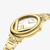 Polished yellow-gold-colored stainless steel case, yellow-gold-colored stainless steel F insert. Curved off-centered silver-white opaline dial, gray minute track and yellow-gold-colored indices, yellow-gold-colored hands. Polished yellow-gold-colored stainless steel bracelet, F is Fendi logo at 12 and 6 o'clock, yellow-gold-colored stainless steel folding buckle. PRODUCT INFORMATION - Product Code:: FOW802A2YMF0QA0 - Additional details:: Sapphire crystal