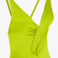 Long sleeveless dress with V neckline and crossed shoulder straps on the back. Loose fitting and feminine with deep asymmetric opening on the front. Invisible rear zipper closure. Made of acid green washed satin. Featuring a draped motif on the neckline and diagonal seams that highlight the silhouette. Made in Italy Composition: : 100% Silk, lining: 100% Silk Model height: null Size worn: null Product Code: FDB998AM3DF1J77