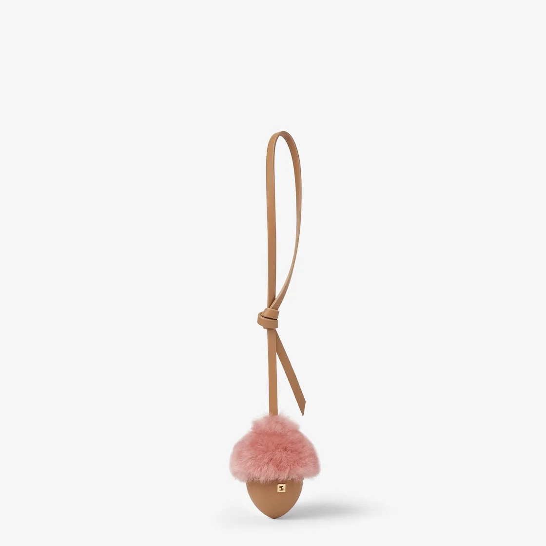 Customized acorn-shaped charm with mini FF logo, with opening top. The leather strap allows you to attach it to any bag to create personalized looks. Made of beige leather with pink shearling detail. Gold-finish metalware. Made in Italy Composition: 100% calf leather, 100% sheep fur Product Code: 7AS427AYJ8F1UJ1