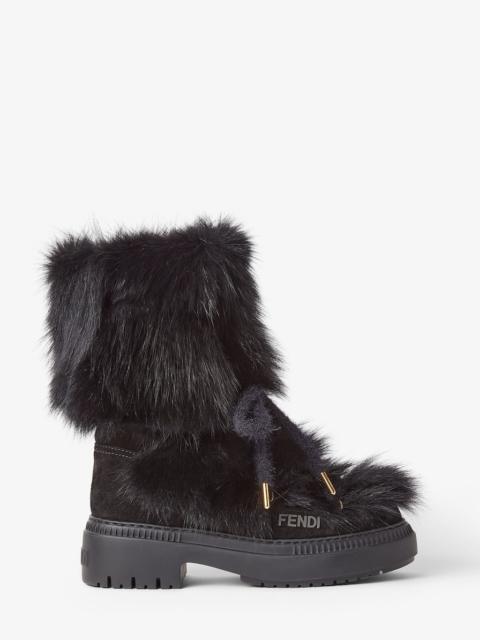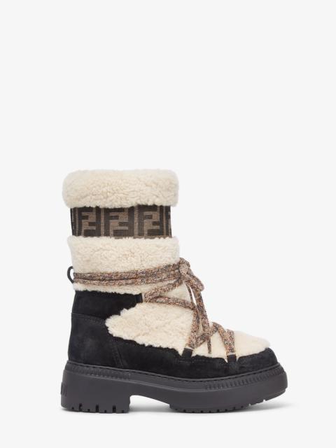 Round-toe apres-ski boots. Chunky rubber sole with embossed Fendi lettering on the back. Made of light brown ‘dorsato’ shearling, characterized by a trompe-l'œil effect that mimics the full, velvety texture of fox fur. Finished with tone-on-tone suede details. Light brown tubular laces, gold-finish metal ends and hooks. Felt lining and padded insole. Made in Italy Composition: 100% sheep fur, 100% calf leather, inside: 100% polyester Product Code: 8T8591AYA1F1TP5