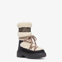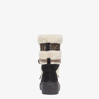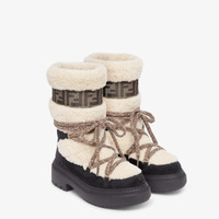 Round-toe apres-ski boots. Made of white sheepskin with black suede details. The leg is embellished with a jacquard fabric detail with an iconic brown FF motif. Multicolor laces and metal hooks. Padded inside and lined in felt. Rubber sole and heel with embossed Fendi lettering on the back. Made in Italy Composition: 100% sheep fur, 100% calf leather, 65% polyamide, 35% cotton, 100% resin, inside: 100% polyester Product Code: 8T8591AOSSF1QJH
