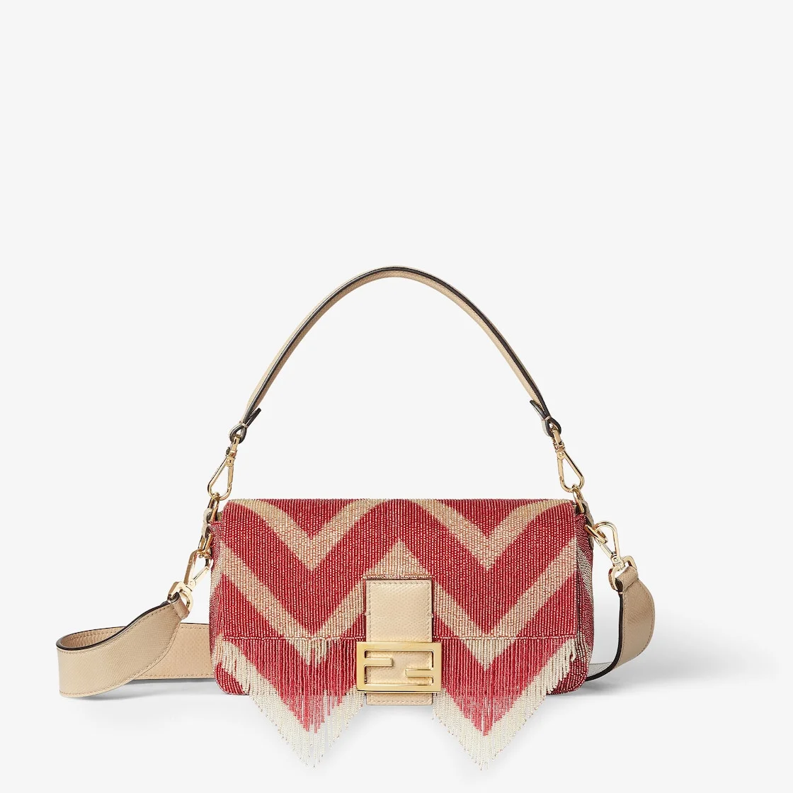 Iconic medium Baguette bag, created in 1997 that went on to become the first “It” bag. Versatile and with timeless appeal, it features the iconic underarm design inspired by the French Baguette bread from which it takes its name. Entirely embroidered by hand using light yellow and red beads that create a chevron motif, embellished with long suspended fringes. Trimmed in beige karung and embellished with an FF clasp. Featuring a front flap, magnetic clasp, red satin-lined internal compartment with a zipper pocket and gold-finish metalware. The bag can be carried by hand, or worn either on the shoulder or cross-body thanks to the karung handle and shoulder strap, both detachable. Made in Italy Composition: 100% silk, embroidery: 95% glass, 5% polyester, 100% karung snake leather, inside: 72% viscose, 8% silk Product Code: 8BR600AVN8F1U3R