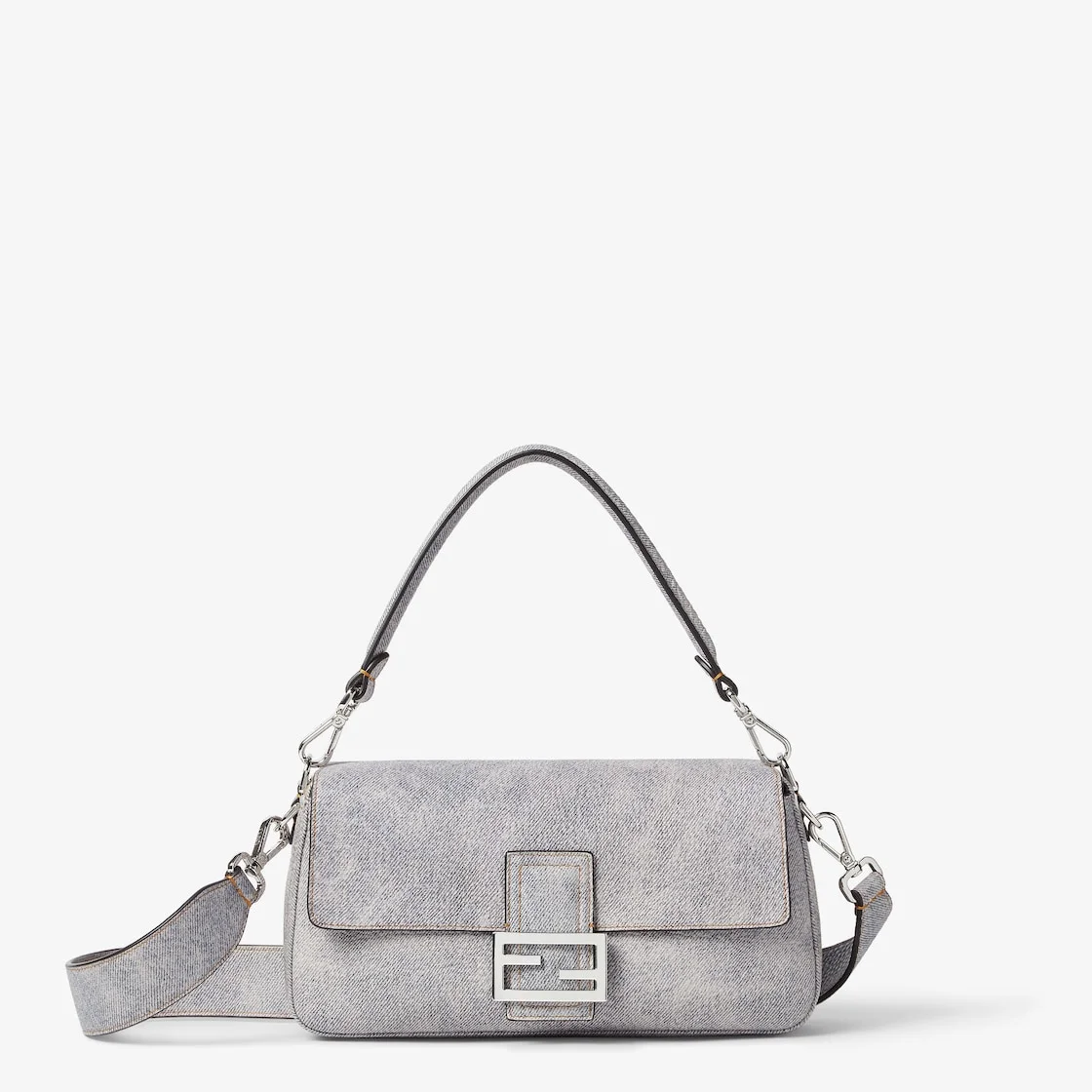 Iconic medium Baguette bag, created in 1997 that went on to become the first “It” bag. Versatile and with timeless appeal, it features the iconic underarm design inspired by the French Baguette bread from which it takes its name. Crafted from gray Cuoio Romano leather, a calfskin with a distinctive natural grain, produced using a metal-free tanning process and featuring a unique denim-effect finish. Finished with contrasting yarn stitching in yellow and embellished with an FF clasp. Featuring a front flap, magnetic clasp, unlined internal compartment and buttoned pocket, Fendi Roma lettering applique and palladium-finish metalware. The bag can be carried by hand or worn either on the shoulder or cross-body thanks to the handle and shoulder strap, both detachable. Made in Italy Composition: 100% calf leather, inside: 100% calf leather Product Code: 8BR600AV1SF0ATR