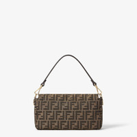 Iconic medium Baguette bag, created in 1997 which went on to become the leading It bag. Versatile and with timeless appeal, it features the iconic underarm design inspired by the French Baguette bread from which it takes its name. Made of iconic FF jacquard in tobacco brown. Its soft construction captures the allure of the original design, reinterpreting it in a contemporary style suitable for any occasion. Decorated with an FF clasp. Featuring a front flap, magnetic clasp, internal compartment lined in jacquard fabric, and zip pocket. Gold-finish metalware. The bag can be carried by hand or worn either on the shoulder or cross-body thanks to the dark brown calfskin handle and shoulder strap, both detachable. Made in Italy Composition: 75% polyester, 17% cotton, 8% elastane, inside: 100% calf leather, 63% cotton, 34% polyester, 3% acrylic Product Code: 8BR600AFPMF1GL7