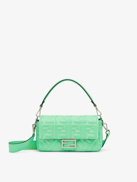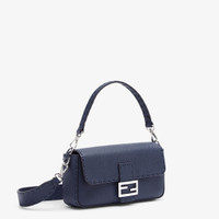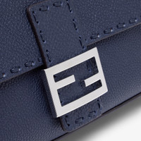 Iconic medium Baguette bag, made of midnight blue Cuoio Romano leather embellished by hand with tone on tone stitching. Decorated with an FF clasp. Featuring a front flap, magnetic clasp, internal compartment with zipper pocket and leather Selleria stamp, and palladium-finish metalware. The bag can be carried by hand, or worn either on the shoulder or cross-body thanks to the handle and shoulder strap, both detachable. Made in Italy Measurements: - Height : 15 cm - Depth : 6 cm - Width : 27 cm - Weight : 1.11 kg - Strap length (max) : 90 cm Composition: 100% calf leather, inside: 100% lamb leather Product Code: 8BR600ANT2F19KE