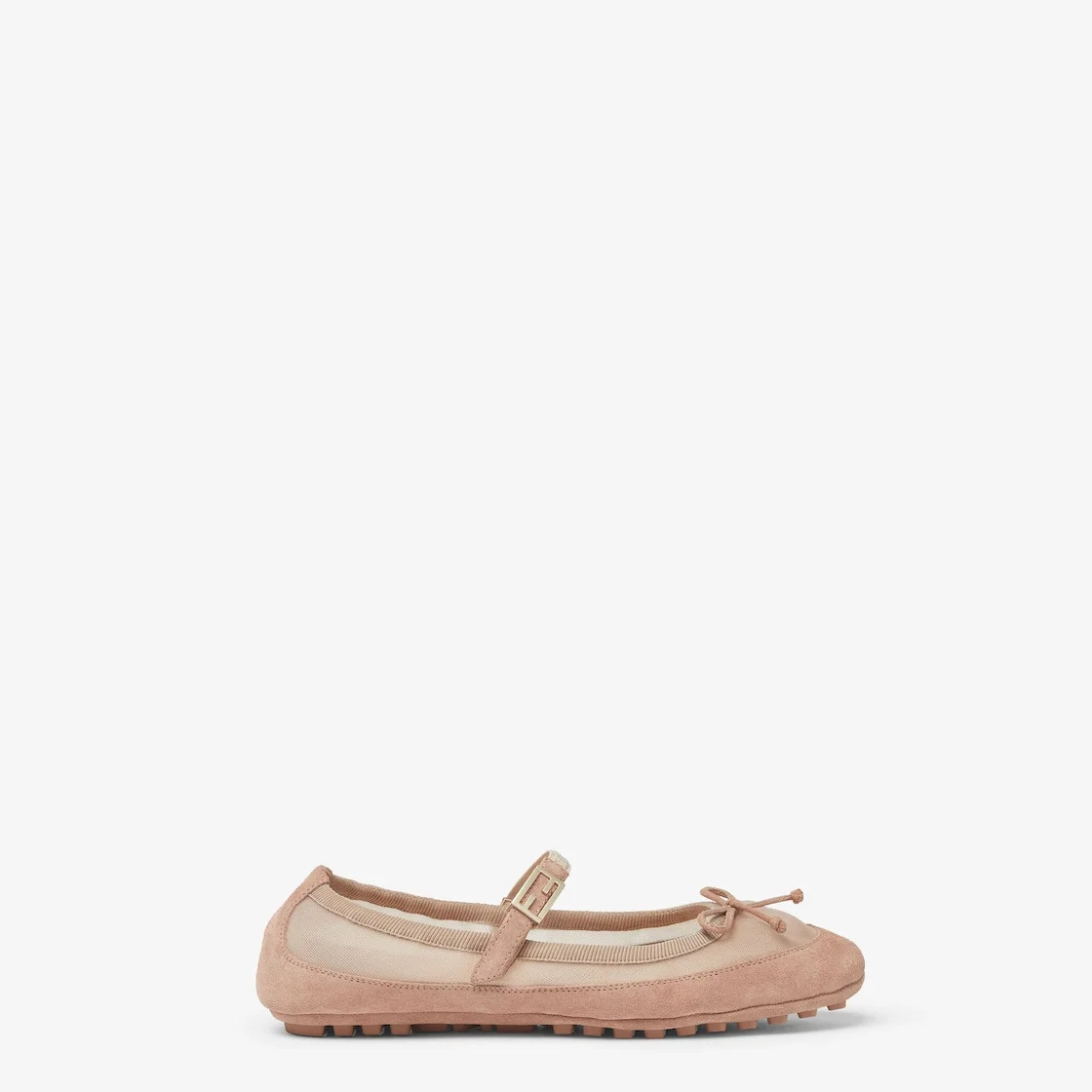 Ballet flats with gathered heel and bow on the topline. Elastic strap with Baguette FF motif. Suede sole with raised rubber inserts. Made of pink mesh and suede. Gold-finish metalware. Made in Italy Composition: 100% calf leather, 100% polyamide, inside: 100% lamb leather Product Code: 8F8689AOLLF1ST6