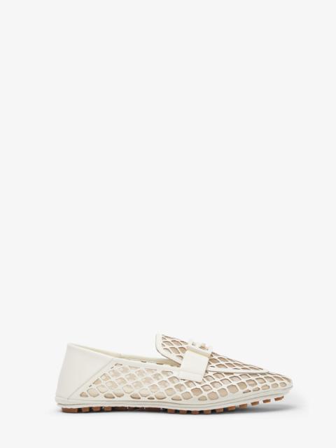 Driving loafers with FF Baguette motif. Suede sole with raised rubber inserts. The heel can be folded to wear the style as a sabot. Made of beige leather with perforated motif on a base of nude-color mesh for a see-through effect. Matching enameled FF detail. Made in Italy Composition: 100% calf leather, inside: 100% sheep Product Code: 8D8514AU35F1SZS