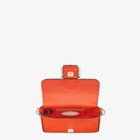 Mini iconic Baguette bag made with 309 tone-on-tone macro topstitches, an emblem of the iconic Selleria workmanship. Made of red Cuoio Romano leather, calfskin with a characteristic natural grain, produced with a metal-free tanning process. Featuring a front flap, magnetic clasp, internal calfskin-lined compartment, internal pocket, silver Selleria plate, palladium-finish metalware. Decorated with an FF clasp. The bag can be carried by hand or worn on the shoulder thanks to the handle and shoulder strap, both detachable. Made in Italy Measurements: - Height : 13 cm - Depth : 5 cm - Width : 20 cm - Weight : 0.36 kg Composition: 100% calf leather, inside: 100% sheep leather Product Code: 8BS017ARBBF1OPT