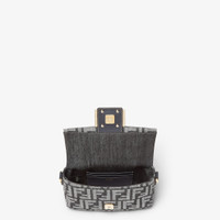 Iconic small Baguette bag made of dark blue denim-effect FF jacquard, embellished with dark blue leather details and FF clasp. Featuring a front flap, magnetic button clasp, one internal compartment lined with tone-on-tone denim-effect jacquard fabric with a pocket and gold-finish metalware. The bag can be carried by hand or worn either on the shoulder or cross-body thanks to the handle and chain shoulder strap, both detachable. Holds a 6.7-inch smartphone, Mini Trifold card holder or wallet, keys and lipstick. Made in Italy Composition: 52% polyester, 48% cotton, 100% calf leather, inside: 52% polyester, 48% cotton Product Code: 8BS017AUT4F1UJ5